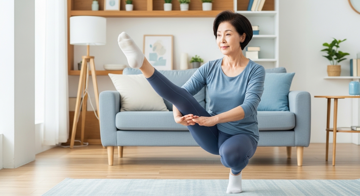 - 방법: 벽이나 튼튼한 의자 옆에 서서 한 손으로 지지합니다. 한쪽 발을 천천히 들어 올려 무릎을 굽히고 10~30초간 유지합니다. 반대쪽 다리로도 반복합니다.